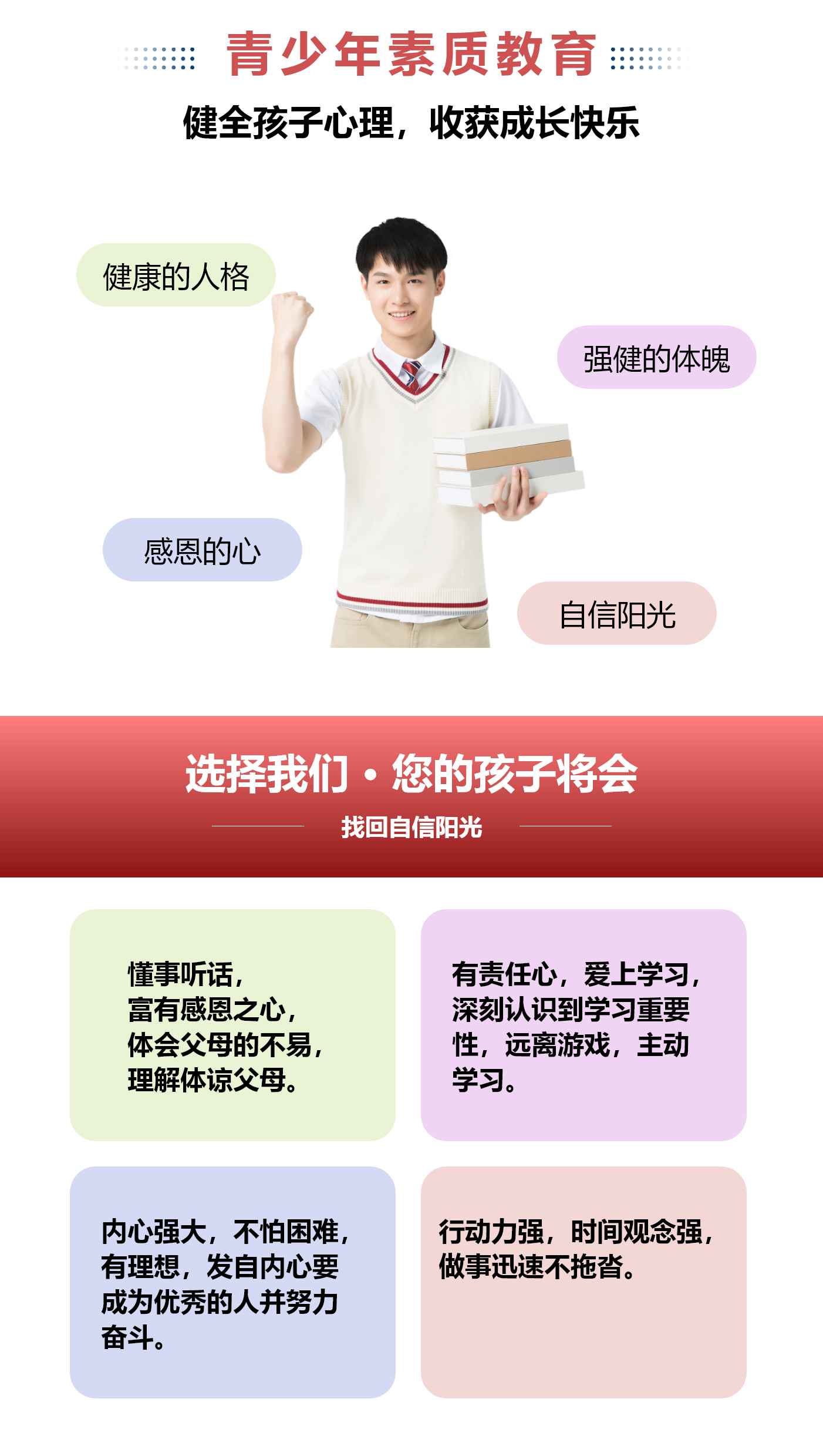 针对12-18岁叛逆/网瘾/厌学青少年,采用心理疏导+行为矫正+文化教育模式,提供全封闭军事化管理。